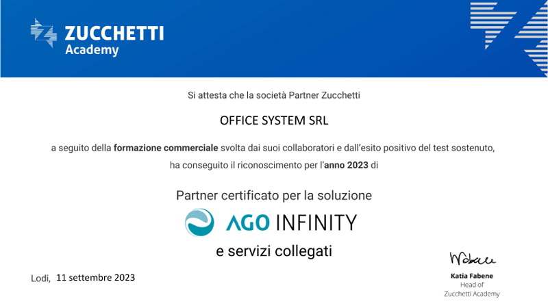 Idoneità commerciale Partner Zucchetti 2023 per la soluzione software Ago Infinity